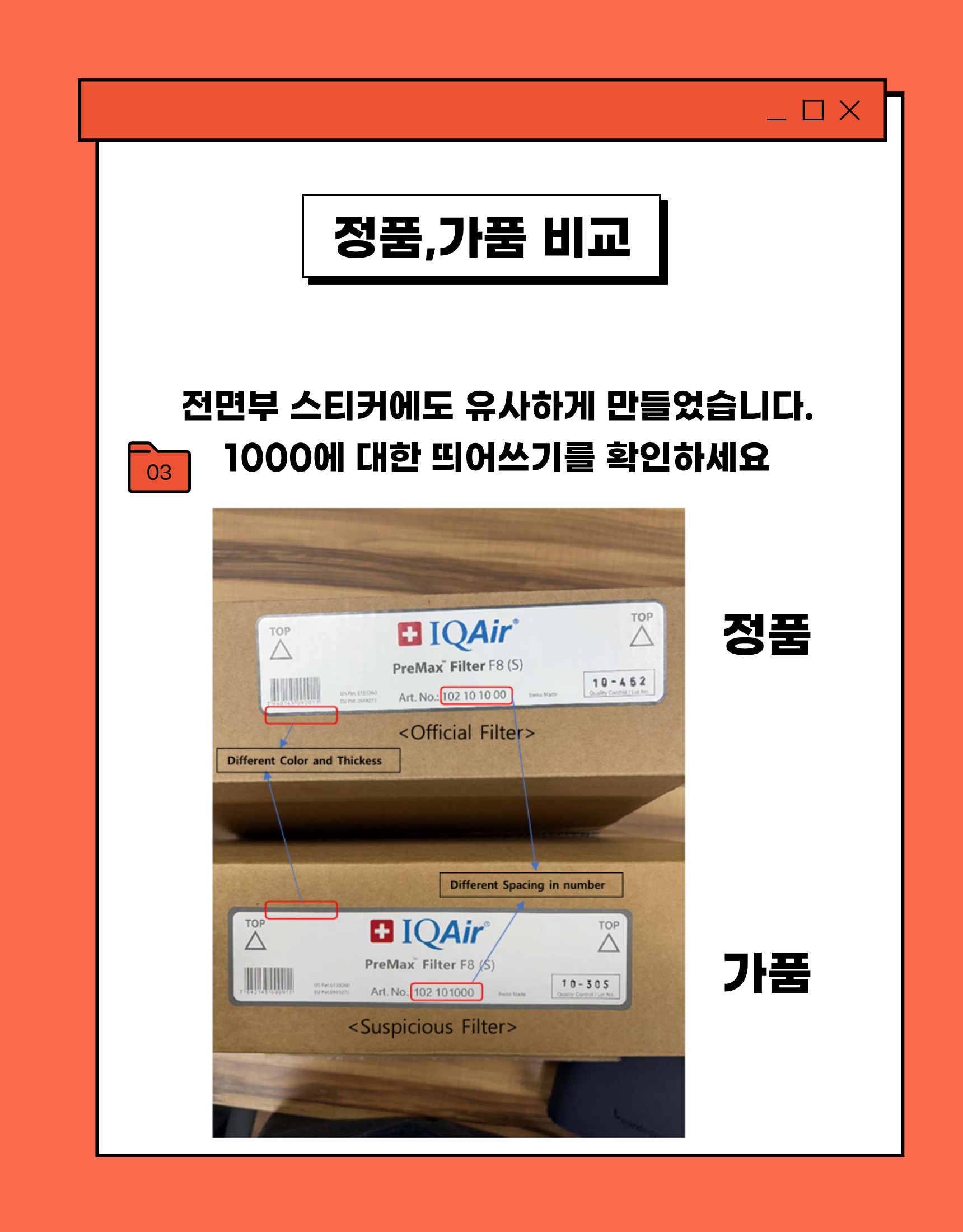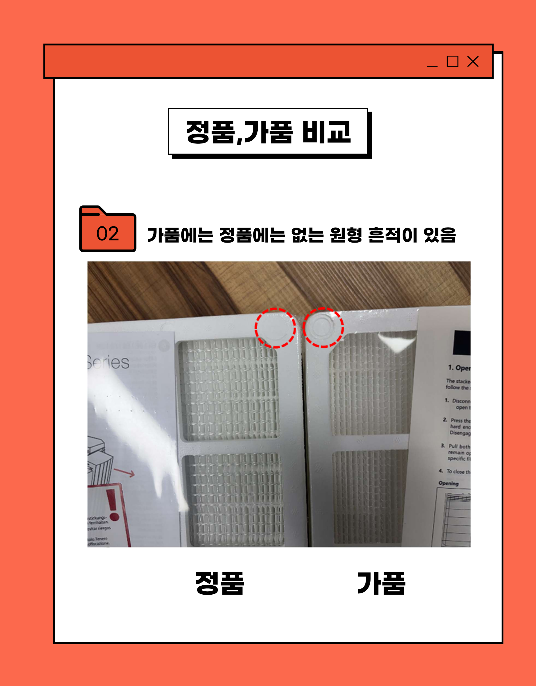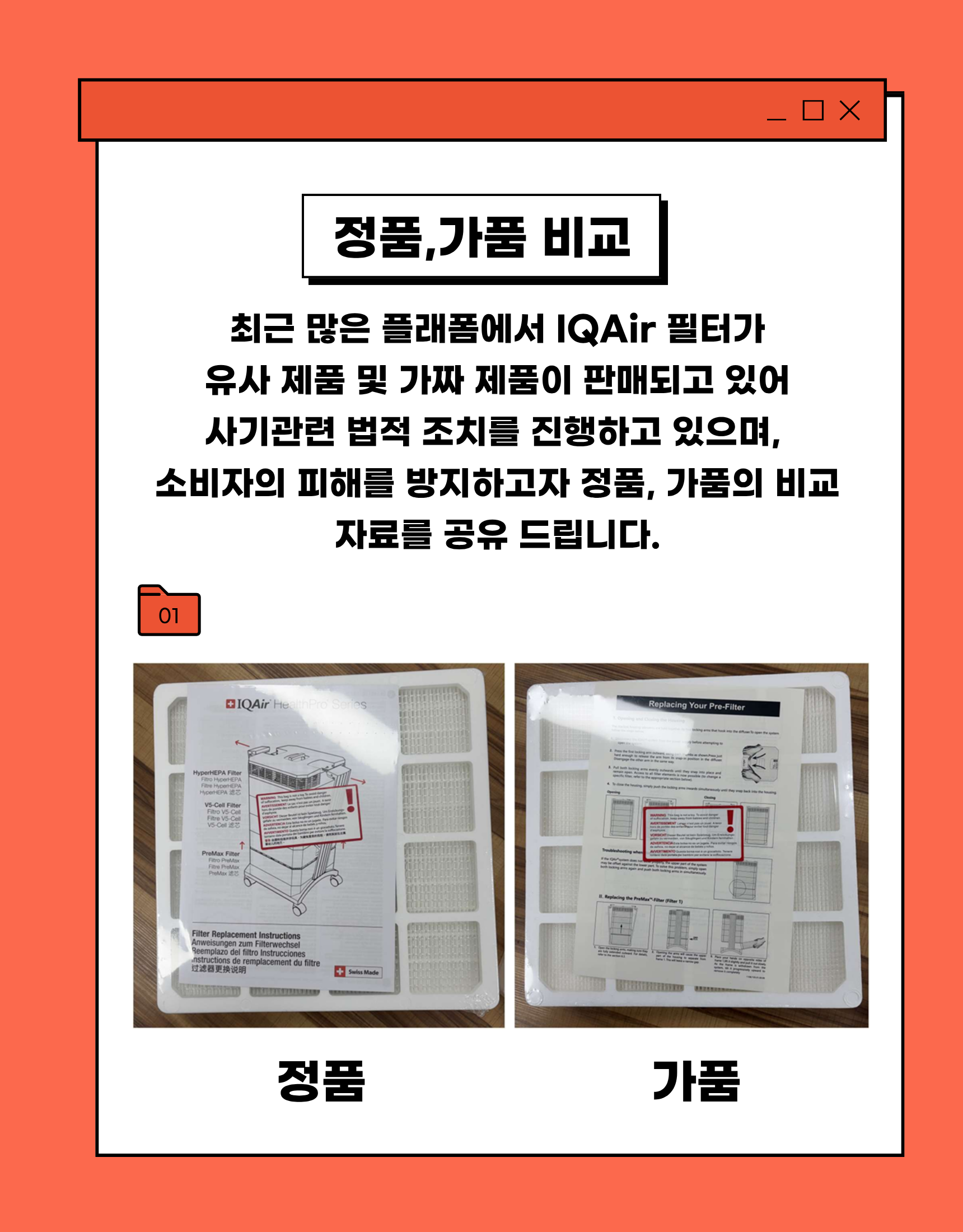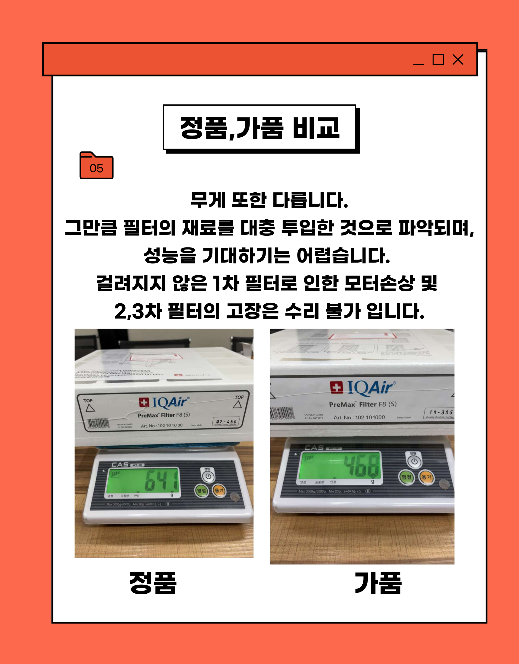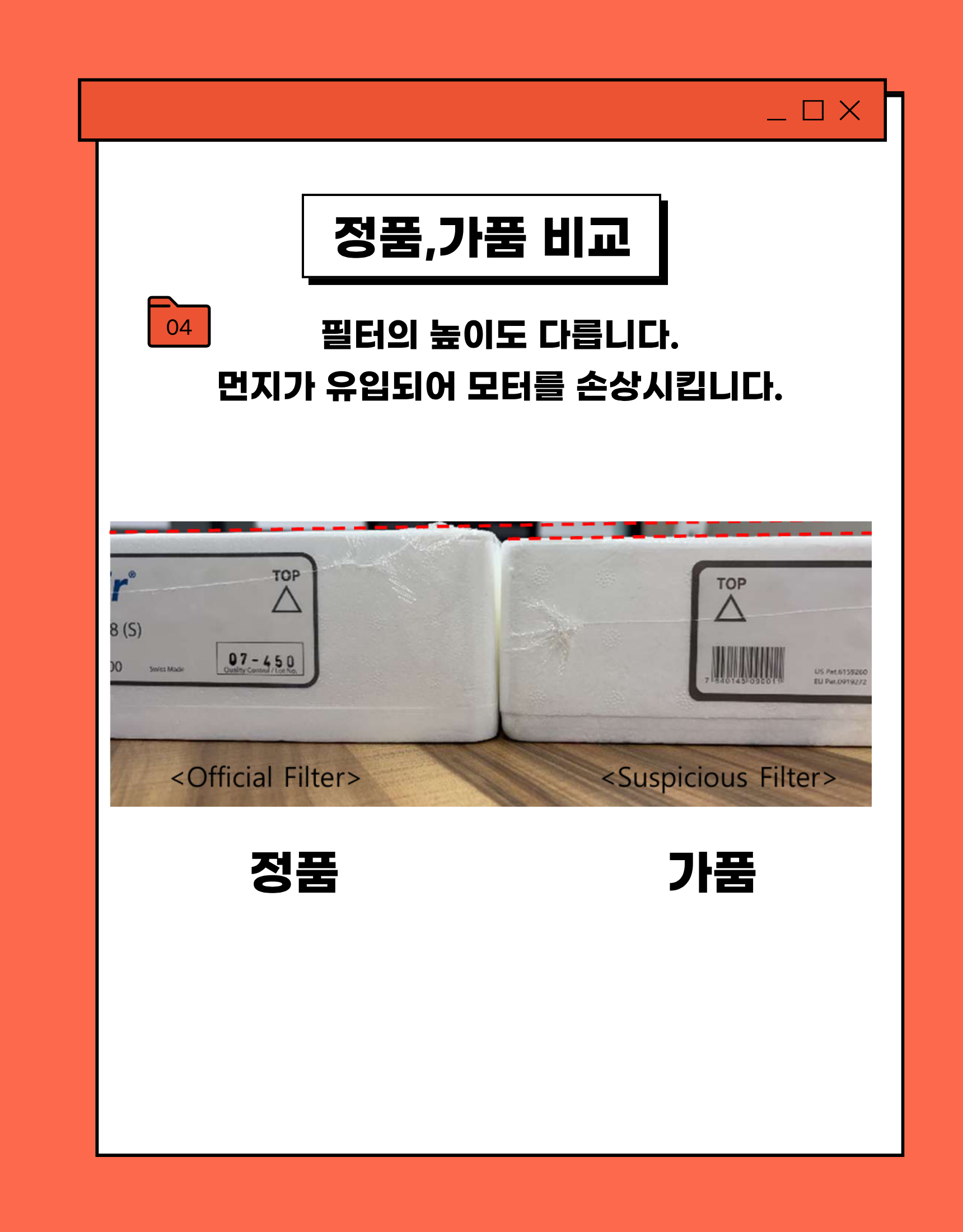 정품필터와 가짜필터 비교(스위스 본사로부터 가품임을 확인하였습니다)
